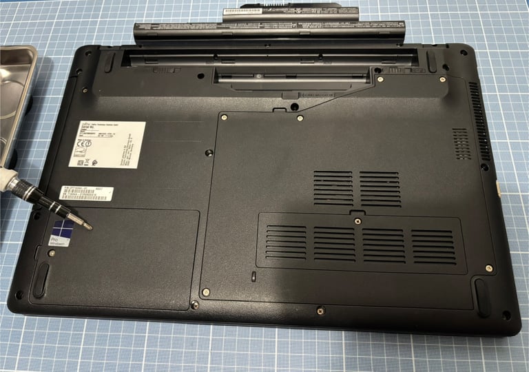Ouverture du compartiment renfermant le SSD ainsi que celui derrière lequel se cachent les barrettes de RAM.